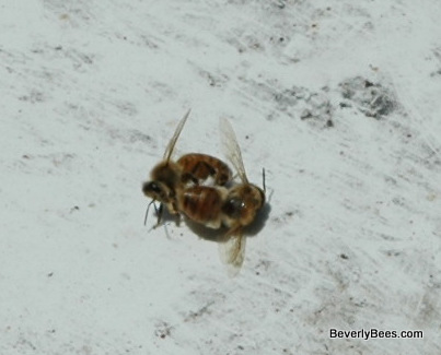 An undertaker bee struggling to cart away a drone bee. She is attempting to fly but can’t get off the ground and is dragging the bee instead.